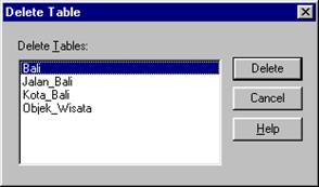 Bila kita ingin menghapus satu tabel secara keseluruhan, sebaiknya jangan menghapus melalui DOS command atau windows explorer. Disarankan menghapus tabel melalui menu Table - Maintenance - Delete Table agar file-file yang berhubungan dengan tabel tersebut dapat dihapus semua. Penghapusan tabel akan memunculkan kotak dialog berikut.